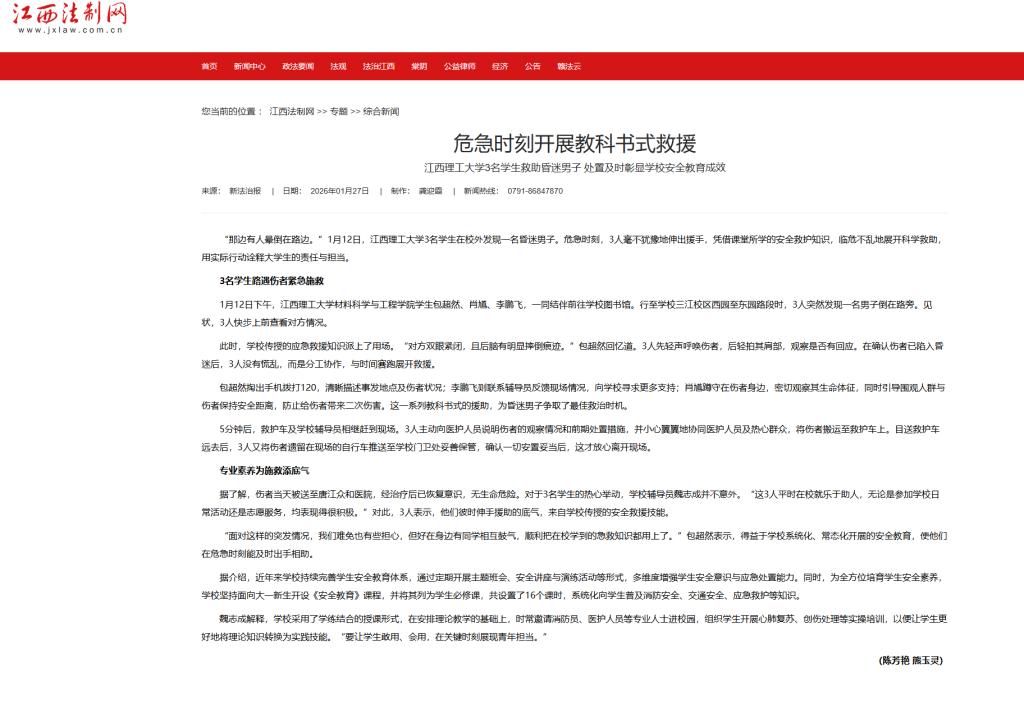 那边有人晕倒在路边。”1月12日,江西理工大学3名学生在校外发现一名昏迷男子。危急时刻,3人毫不犹豫地伸出援手,凭借课堂所学的安全救护知识,临...